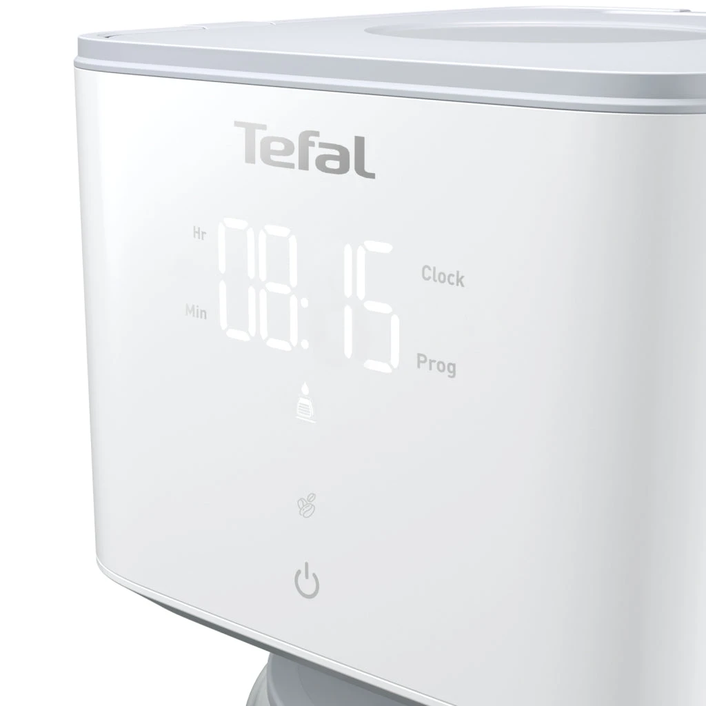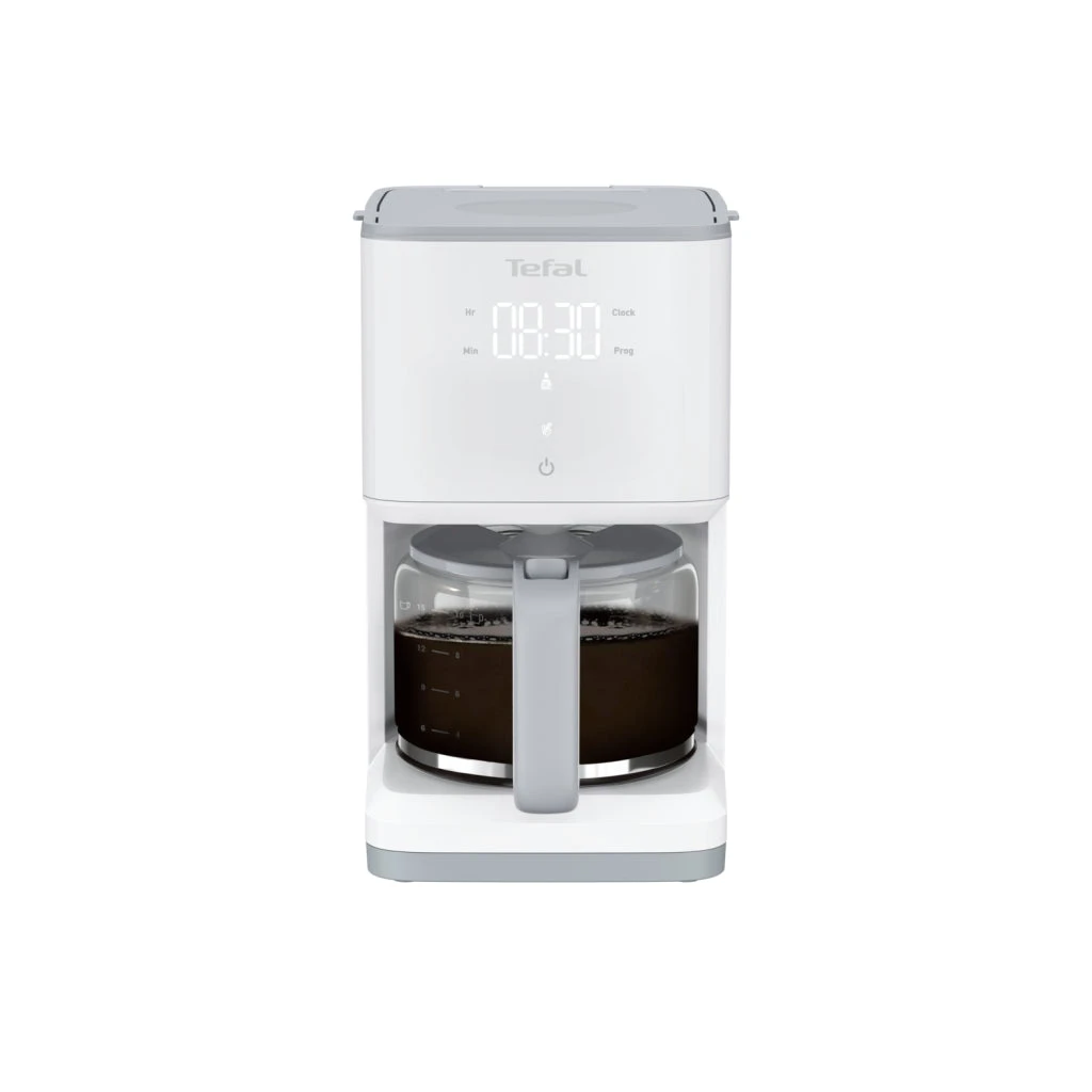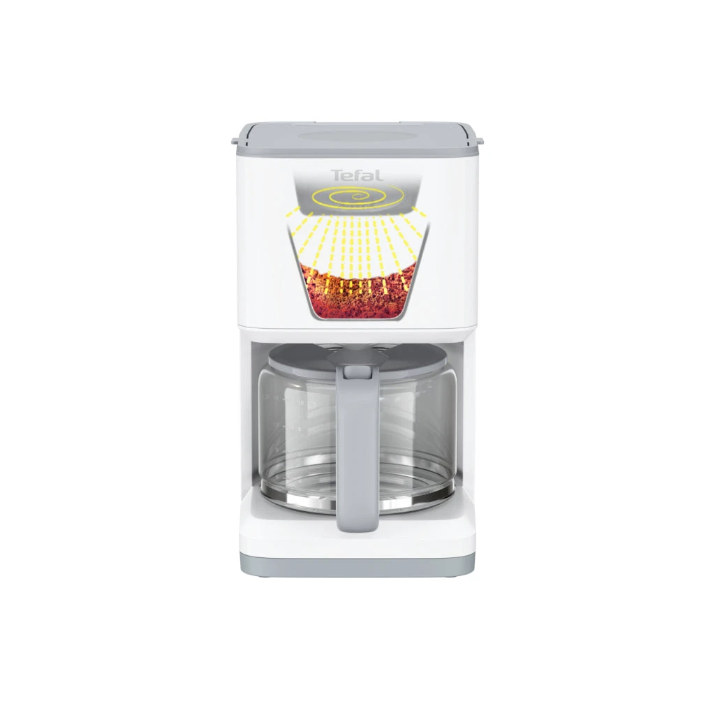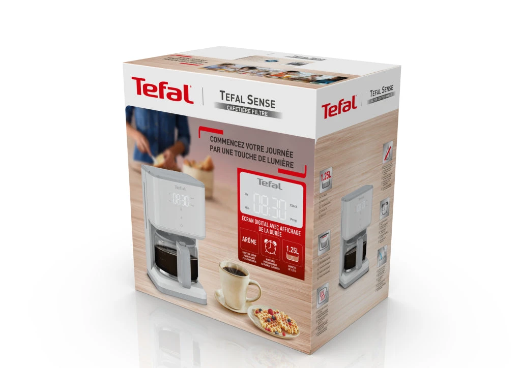 Tefal Sense koffiezetapparaat: Perfecte koffie met één druk op de knop De Tefal Sense is de perfecte manier om met één druk op de knop je dag een kick te geven. Dit gebruiksvriendelijke koffiezetapparaat met filter kan tot wel 15 koppen in één keer zetten. De grote filterhouder en AROMA-functie ? voor tweestapskoffiebereiding ? garanderen smaakvolle, aromatische koffie, elke keer weer. De bediening van dit koffiezetapparaat met filter is eenvoudig, en de timer kan tot wel 24 uur van tevoren ingesteld worden, zodat er precies op het juiste moment een lekkere kop koffie op je staat te wachten. Til je koffie-ervaring naar een hoger niveau, dankzij handige functies: de machine schakelt automatisch uit na 30 minuten, de druppelstop zorgt ervoor dat je op elk moment tijdens het koffiezetten kunt uitschenken en de inhoud van 1,25 liter is genoeg voor 15 koppen heerlijke koffie.